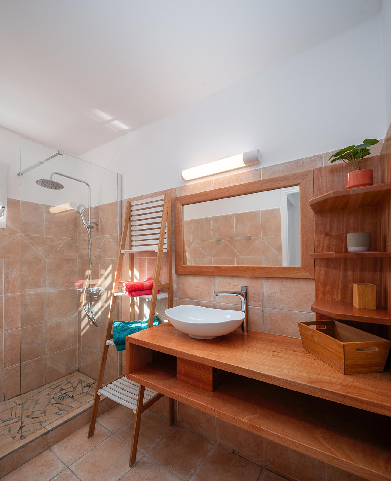 Salle de bain moderne avec douche à l’italienne, sèche-cheveux, et linge de toilette fourni