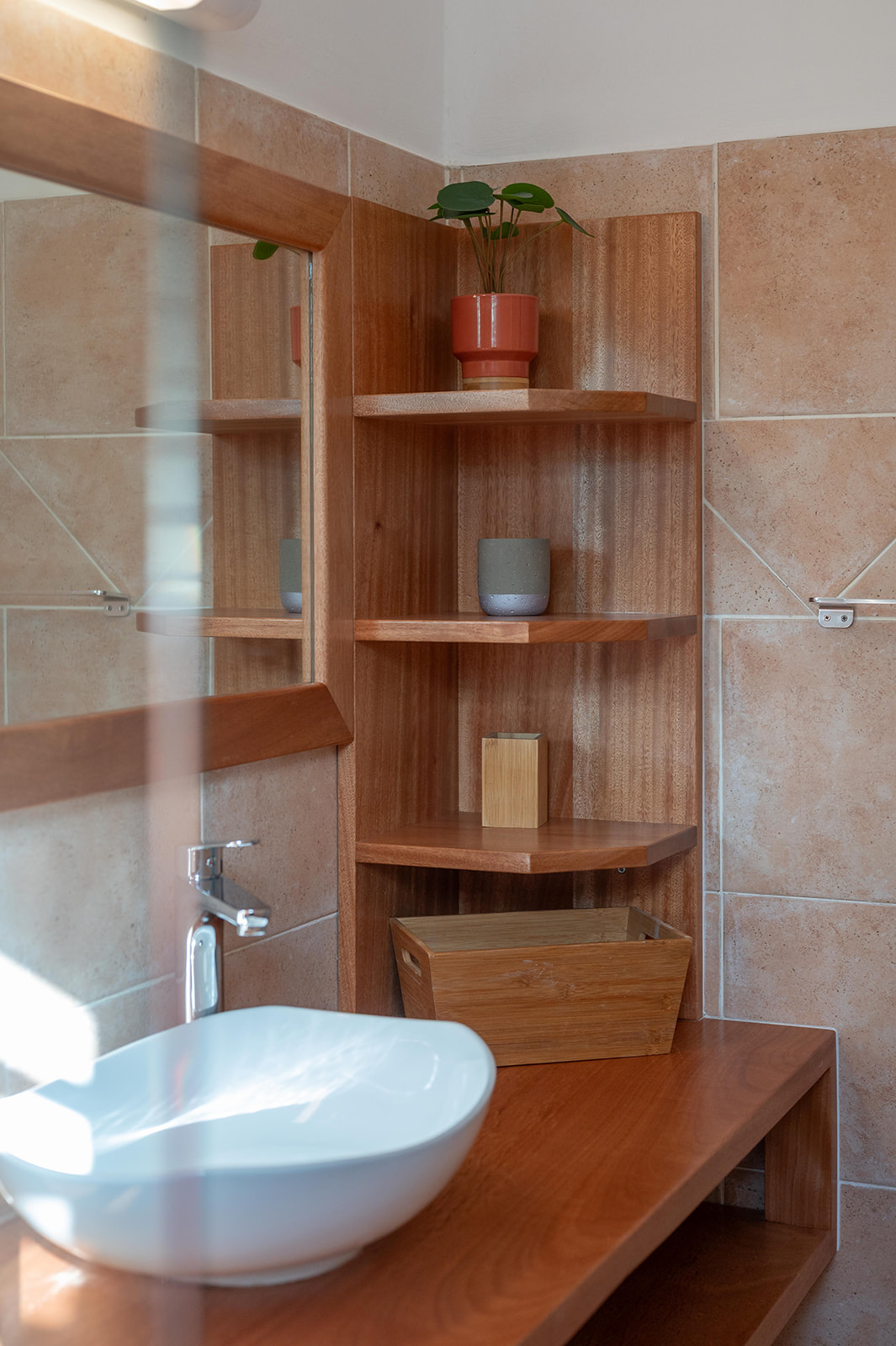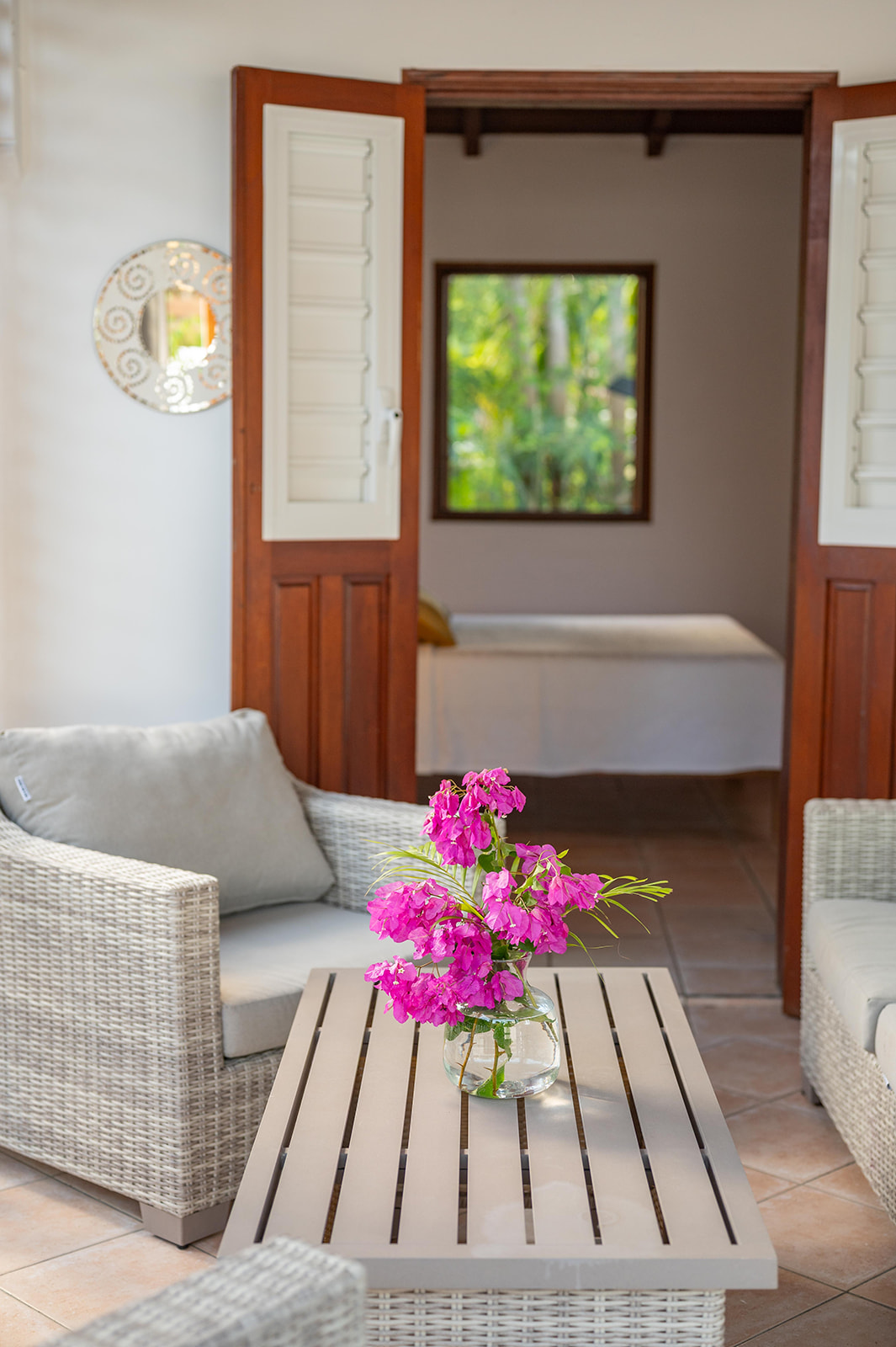 Terrasse en bois donnant sur le jardin tropical, parfaite pour se détendre ou partager un repas