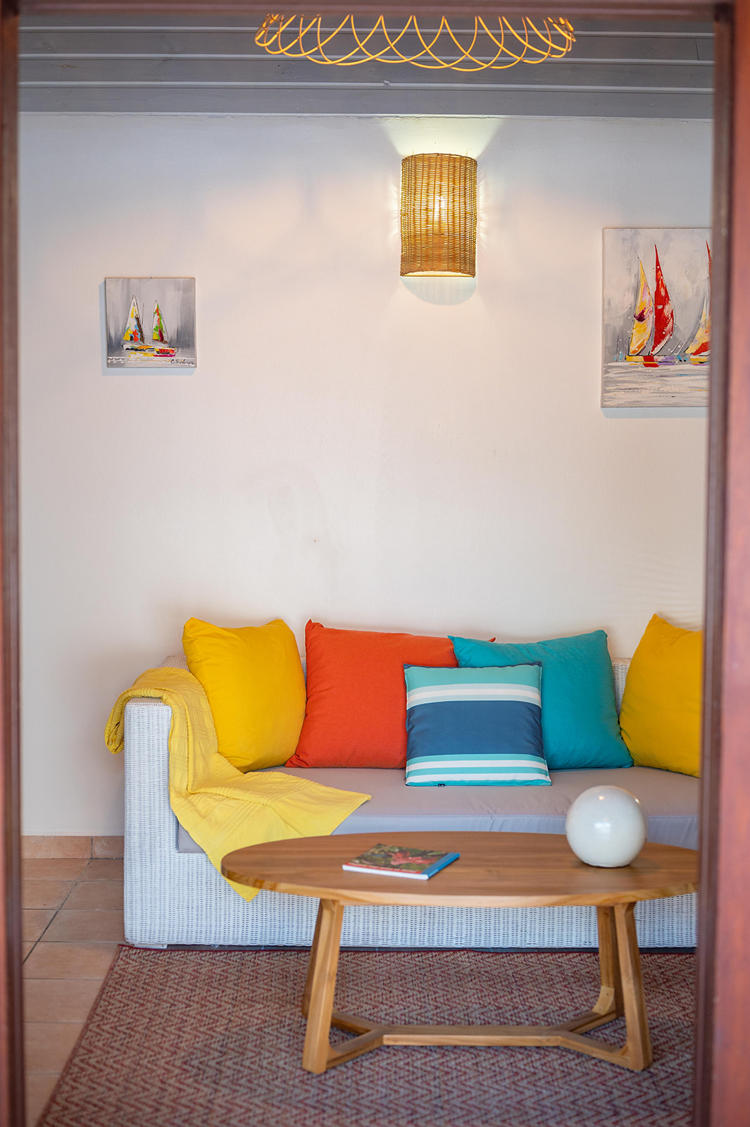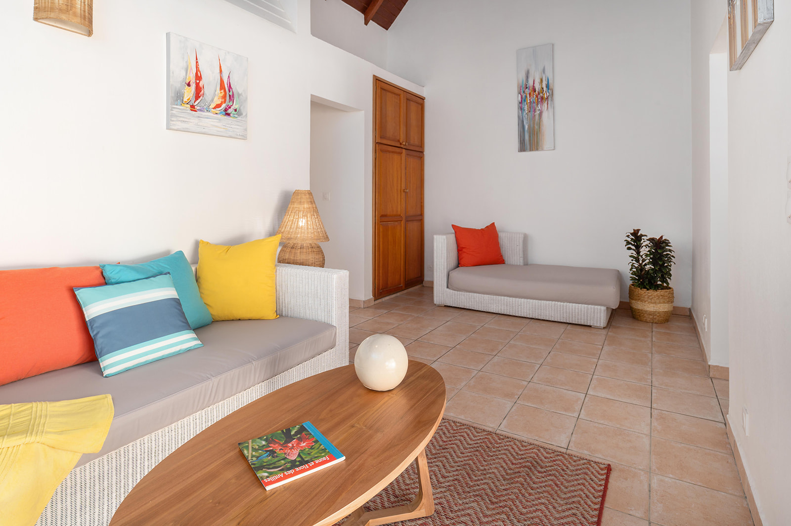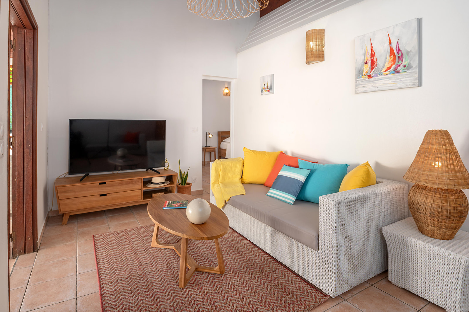 Salon lumineux à la décoration créole, avec télévision à écran plat