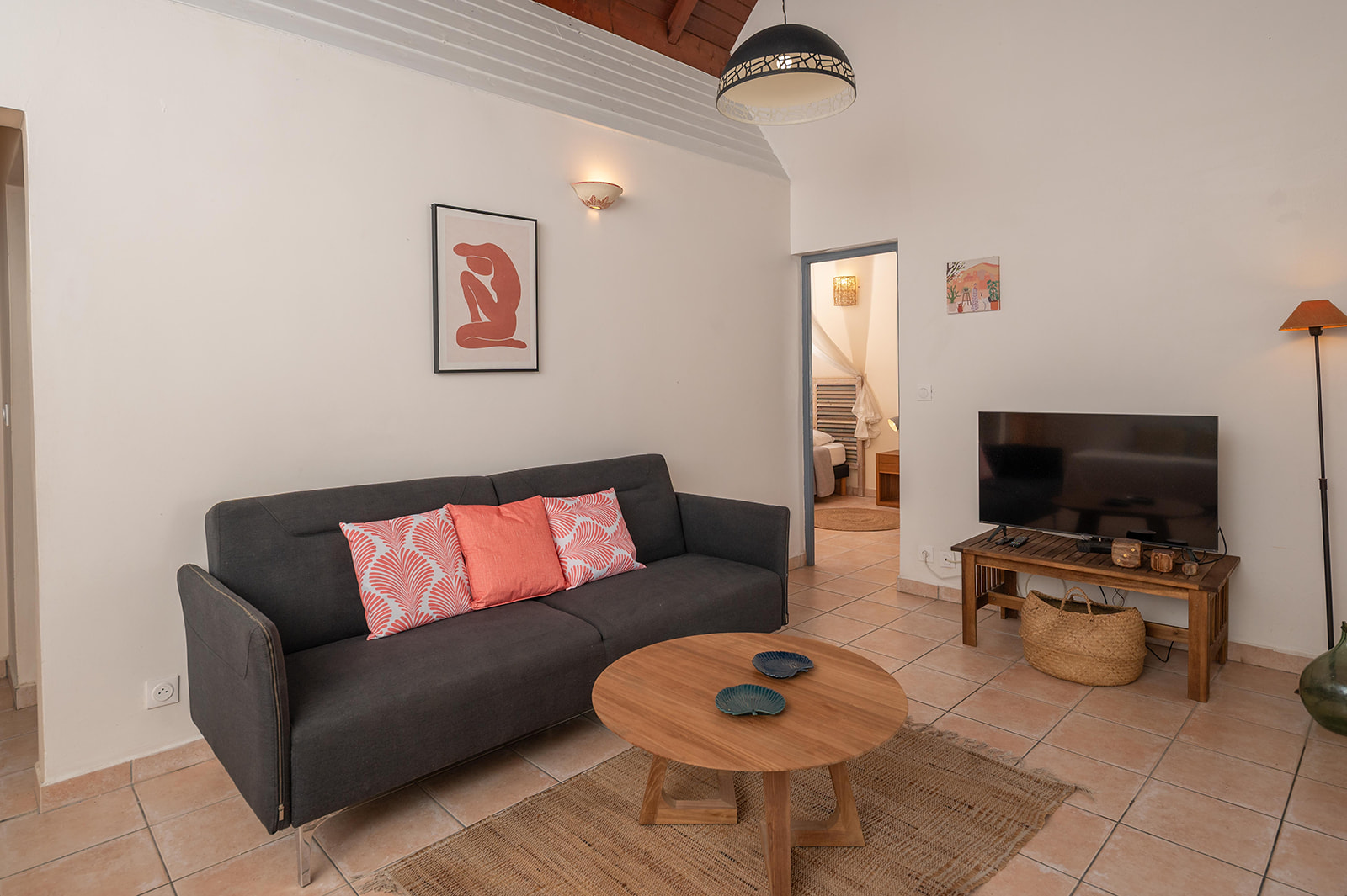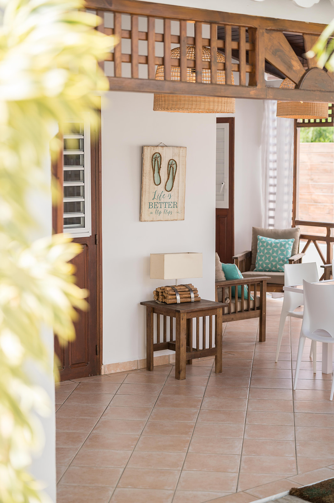 Salon lumineux à la décoration créole, avec télévision à écran plat