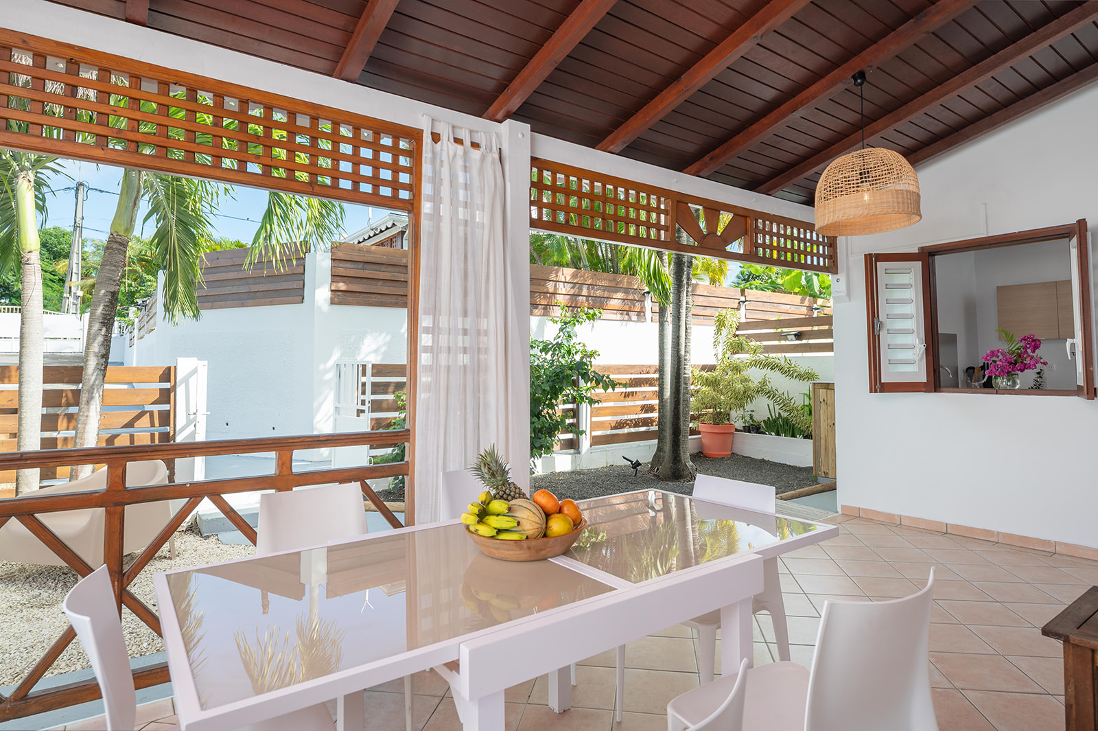 Terrasse en bois donnant sur le jardin tropical, parfaite pour se détendre ou partager un repas