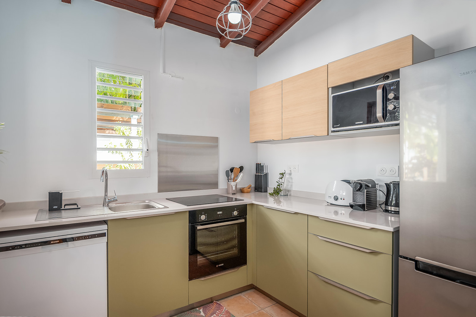 Cuisine entièrement équipée (plaques de cuisson, réfrigérateur, four, ustensiles…), avec un barbecue pour vos repas en plein air