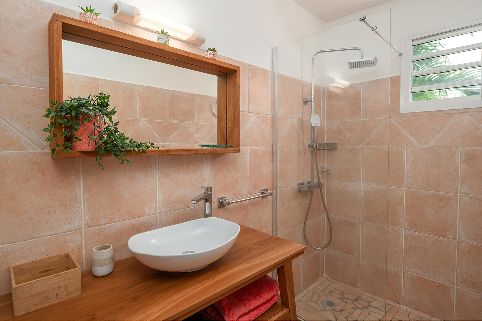 Salle de bain moderne avec douche à l’italienne, sèche-cheveux, et linge de toilette fourni